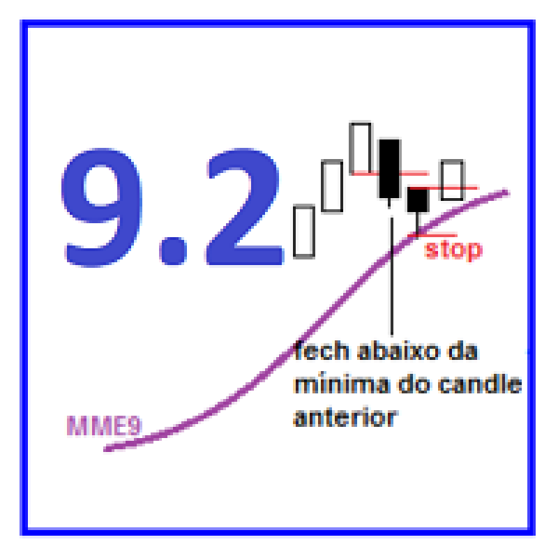 Se a ordem stop de entrada não for acionada no candle seguinte e a MME9 mantiver sua direção, o sinal permanece válido e o indicador irá confirmar. Deve-se então reposicionar a ordem stop de entrada para um tick acima da nova máxima no caso da compra e para um tick abaixo da nova mínima no caso da venda.