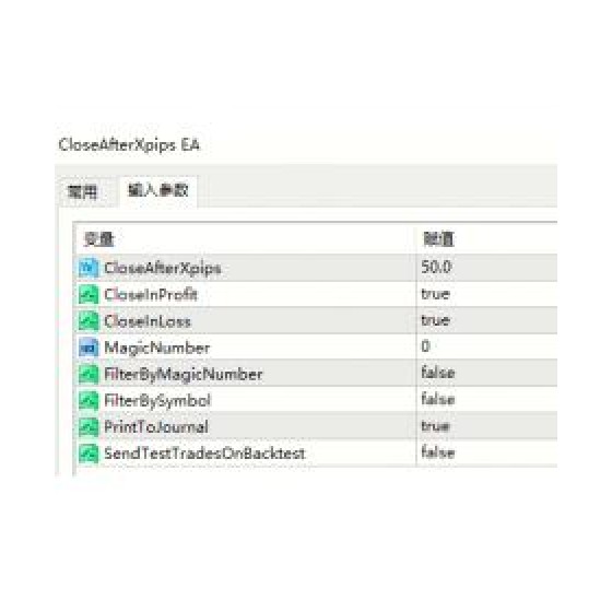 CloselnProfit 盈利多少点后平仓(开关ture 打开,比如CloseAfterXpips是50,那么代表盈利50点平仓,如果是fasle,则表示盈利50点时不做任何操作)