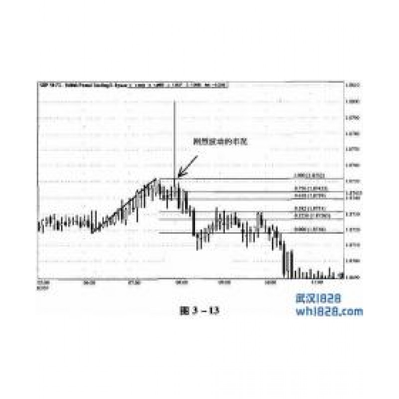 作为在下降趋势中确认一个下降信号的方法,假定汇率从上述比率点(0.25、0.382、0.5、0.618、0.75 )中的任一点反弹。 图3-14中下跌运动从11:00开始,16:00暂停。 根据这个假设的方法,我们在18:00左右对市场作了如下解释。 汇率反弹0.25下跌后,现在仍在此点之下。 这表示下跌的信号。