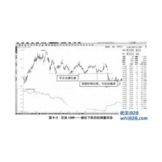 如图9-5所示,豆油1309合约的日K线图显示,价格在长期横向调整的矩形平台被轻松跌破以后,价格短线杀跌后的调整形态出现了。如果投机者判断价格在图中调整形态中反弹上涨,那么可以在图中位置上做多开仓,以便在价格上涨的时候获得利润。