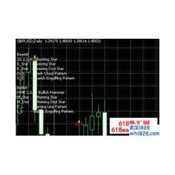 输入参数:Show_Alert (默认 = true) — 如果设置为true,那么当监测到一定形态后会示警。 UseExtraDigit (默认 = false) — 如果您的经纪公司的报价使用额外数字(点),那么您应设置为true。 其它参数 — 打开或关掉多种形态的显示。建议不要更改此项。Pattern Recognition Master(模式识别)外汇指标下载.Pattern Recognition Master(模式识别)外汇指标下载 首先,您应该理解该指标仅能暗示形态。您会在蜡烛台附近看到这些符号,还会在屏幕左上角看到这些符号的图例。第二,您需要知道这些形态有什么作用,何时是空头头寸的信号,何时是多头头寸的信号。对于经验丰富的日本蜡烛图台形态的交易商来说,该指标是一种非常有用的工具,但对于其他交易商来说,可能毫无用处。