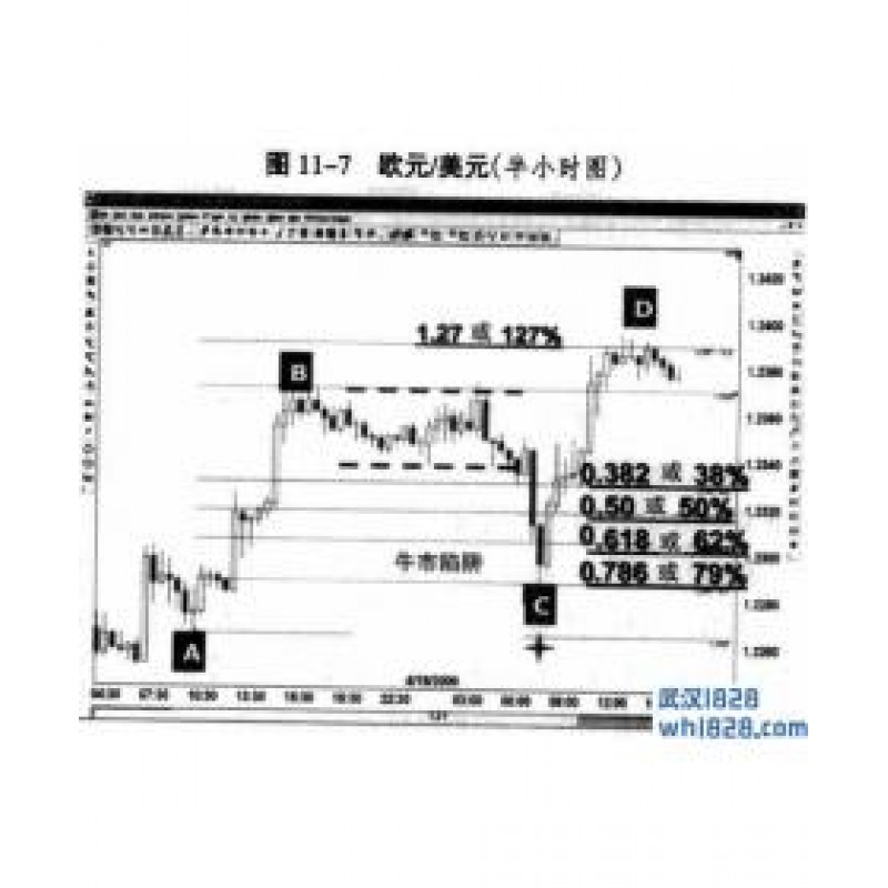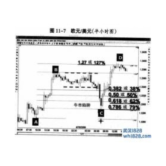 熊市陷阱与牛市陷阱相反。调整形成后,没有基本公告,熊市陷阱是调整上的一个错误突破,除了达到斐波那契回转水平外,没有其他影响,然后按照之前的趋势掉头,走向斐波那契D扩张水平(如图11-8所示)。