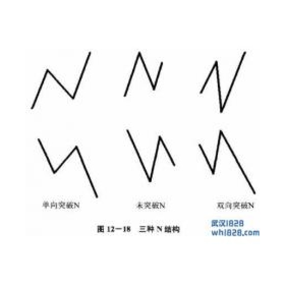 n结构如图12~图18所示,第一个是单方面地突破n结构,即,两个波在其间夹着波进行调整,第二个是没有突破n结构,即,波对应于两个波进行调整,第三个是在双向突破n结构,即,一个波在下一个两个波中突破n结构。