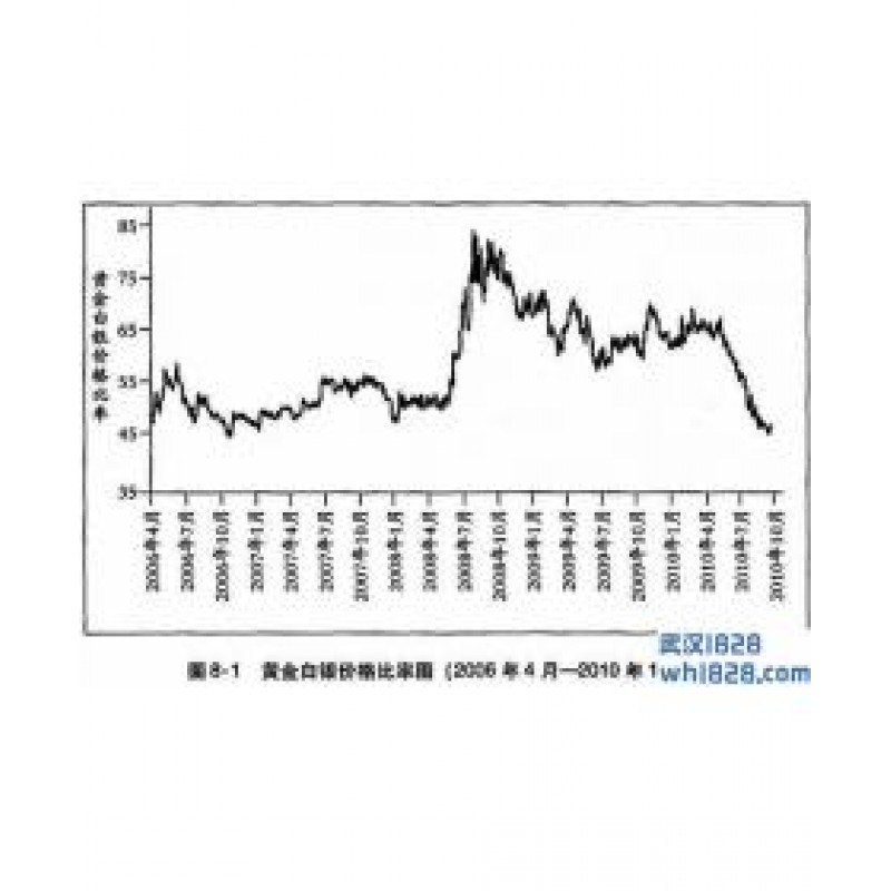 黄金投资的不完善之一是与其他贵重金属如银密切相关,决定黄金的发展趋势与其他投资有很大差异。 之后的章节详细介绍了自然银,银对贵金属的需求情况有着更强的敏感性,这极大地引起了金和自然银的发展趋势。 但是,这两个市场仍然密切相关,金和自然银的比率长期保持稳定。 一百多年前,这个比率是16。 也就是说,每盎司的黄金价值是银价值的16倍。 但是,随着市场对贵重金属的需求变化,现在这个比例也在变化。 近几年来,金银比率在45到85之间持续波动,具体见图8-10。